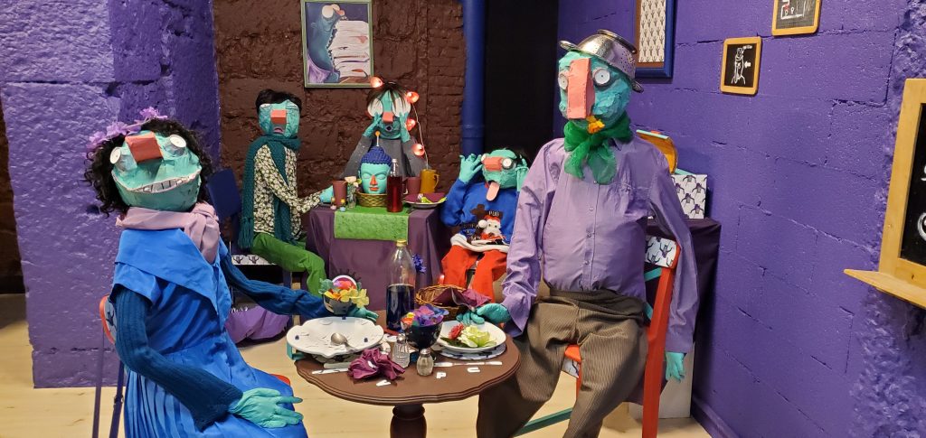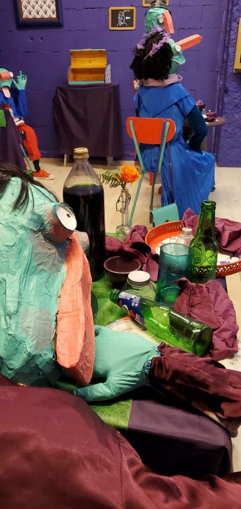 Cette installation constitue un prolongement sculptural de ma série de peintures Ceux qui continuent. En quittant la surface de la toile pour s’incarner à taille réelle, ces personnages s’approprient l’espace physique d’un restaurant imaginaire à travers une matérialité hybride faite de carton, de ferraille, de plastique, de bois, de divers objets de récupération et de mes propres vêtements.