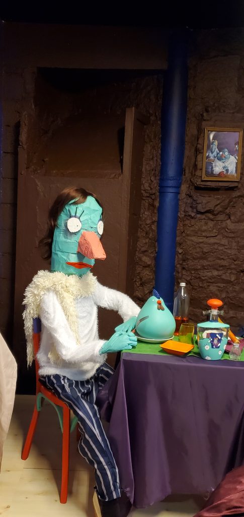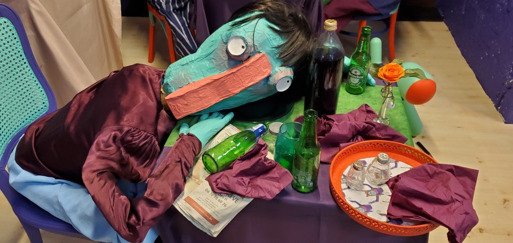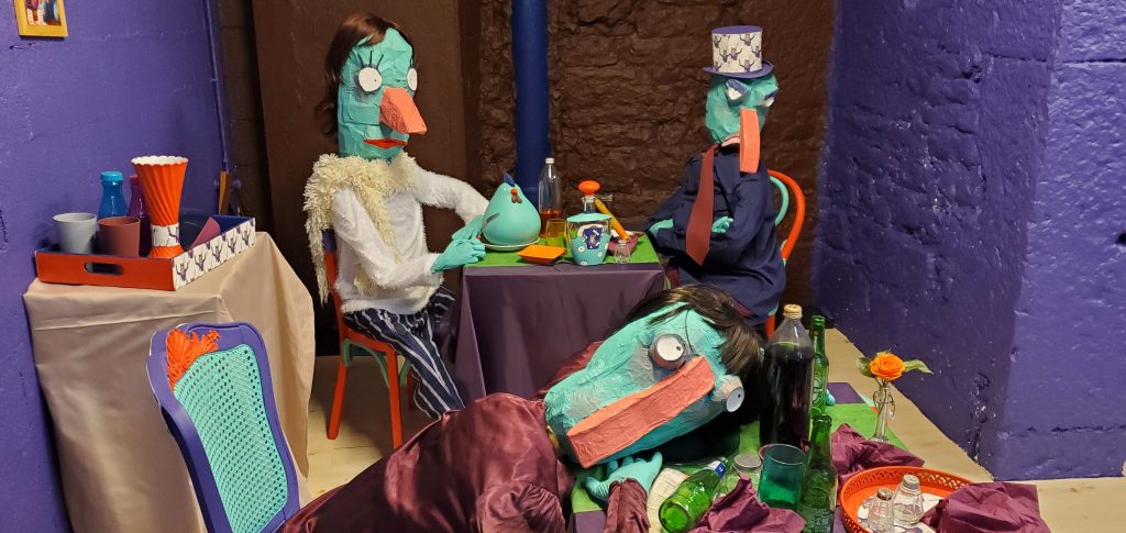 Cette mise en scène souligne avec dérision le décalage de ces êtres qui s’appliquent à jouer leur rôle social. Le simple fait de continuer à manger, malgré l’incohérence de ce qui leur est servi, suffit à maintenir l’illusion d’être ensemble et de participer à une normalité devenue purement mécanique
