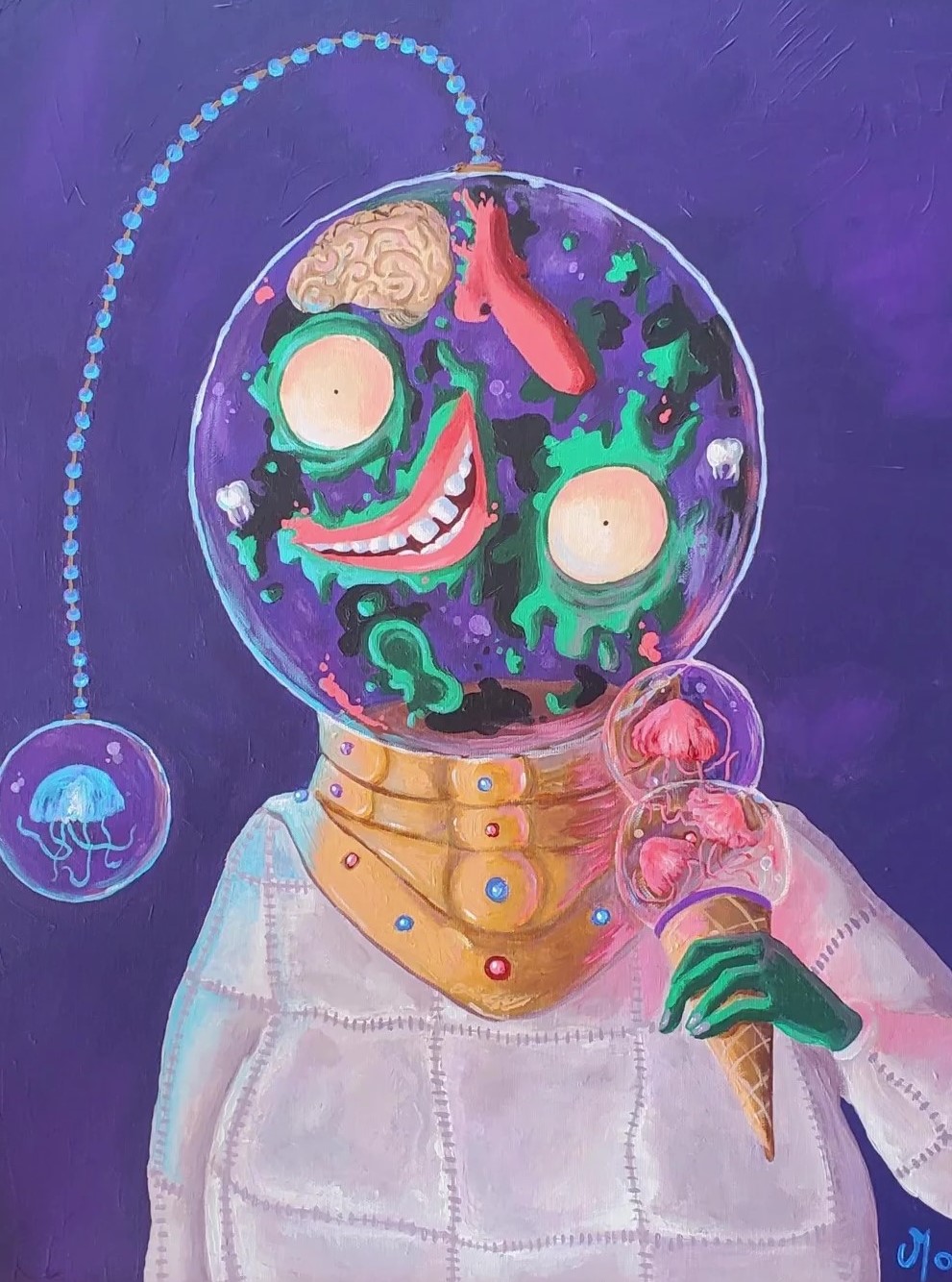 Issu de la série « Ceux qui continuent », ce personnage flotte dans un espace sans repères. On ne sait plus si l’on regarde vers le haut ou vers le bas, ni si l’on se trouve dans les profondeurs de l’océan ou au milieu de la galaxie. C’est une œuvre sur l’égarement et la suspension, où l’eau et l’espace ne font plus qu’un.