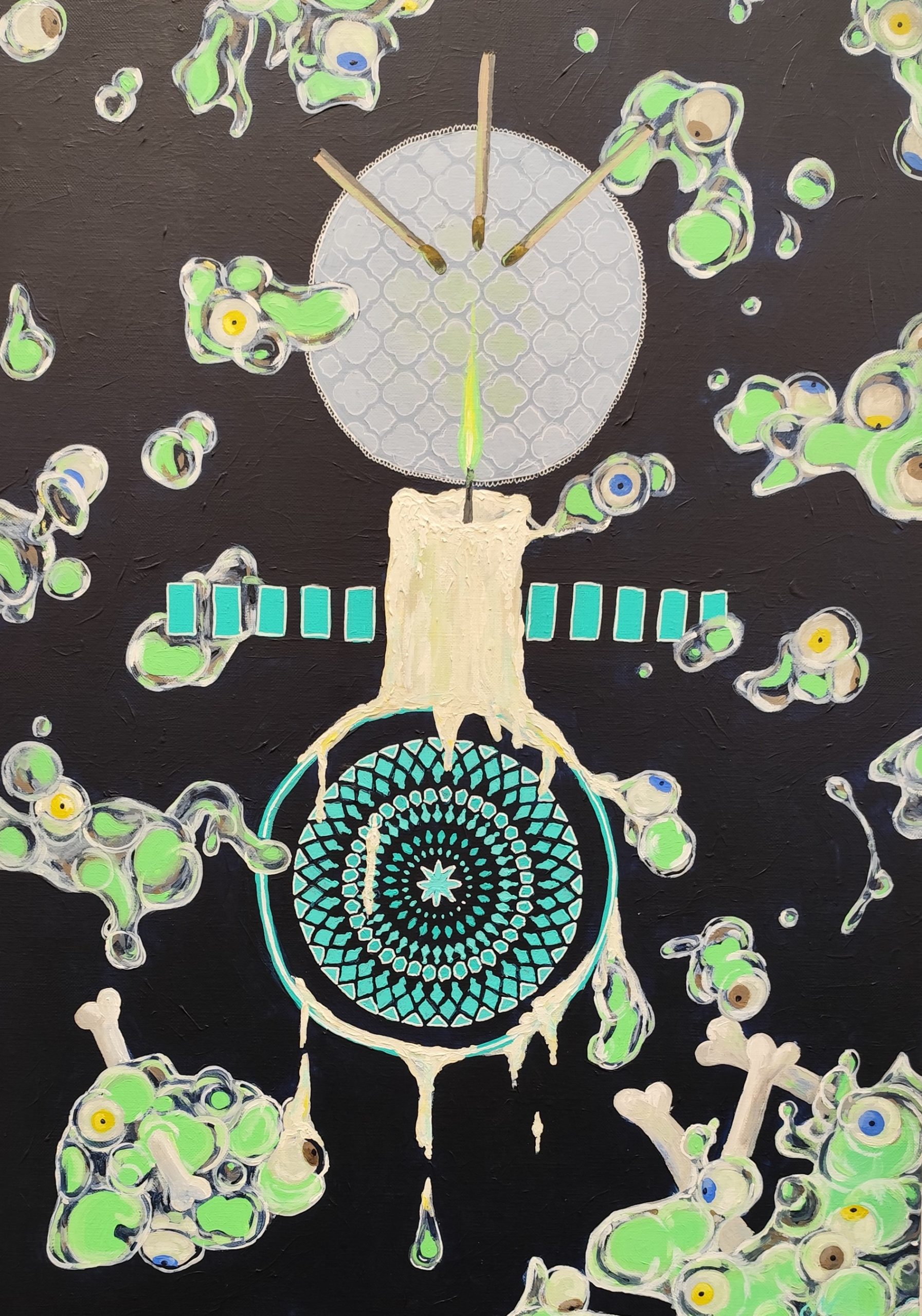 Cette toile s’interroge sur notre capacité réelle à percevoir le monde qui nous entoure. Elle pose la question de la clarté de notre vision : que voyons-nous au juste ? À travers cette œuvre, la réflexion porte sur l’aveuglement, qu’il soit subi ou volontaire, et sur la distinction entre l’acte physique de regarder et la faculté profonde de comprendre ce qui est sous nos yeux.